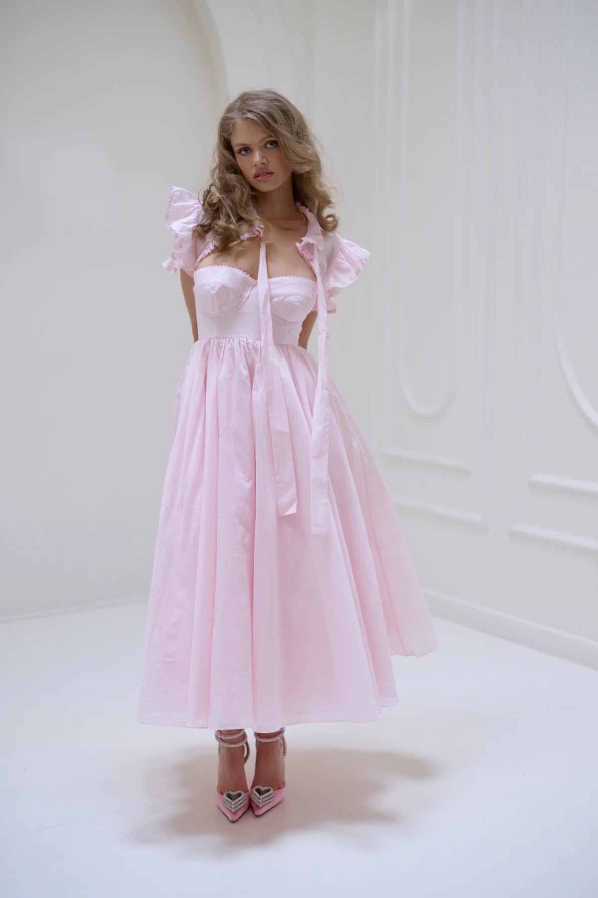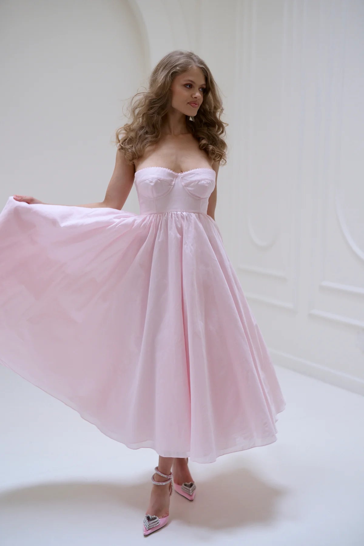 This strapless organdy midi dress features underwire cups, a boned waist, and a triple-layered pleated skirt for a full, airy shape. It's detailed with a ribbon tie, lace trim, and pleated back, adding a vintage-inspired touch. Finished with a cotton lining and an invisible back zipper, it’s romantic, structured, and effortlessly elegant.