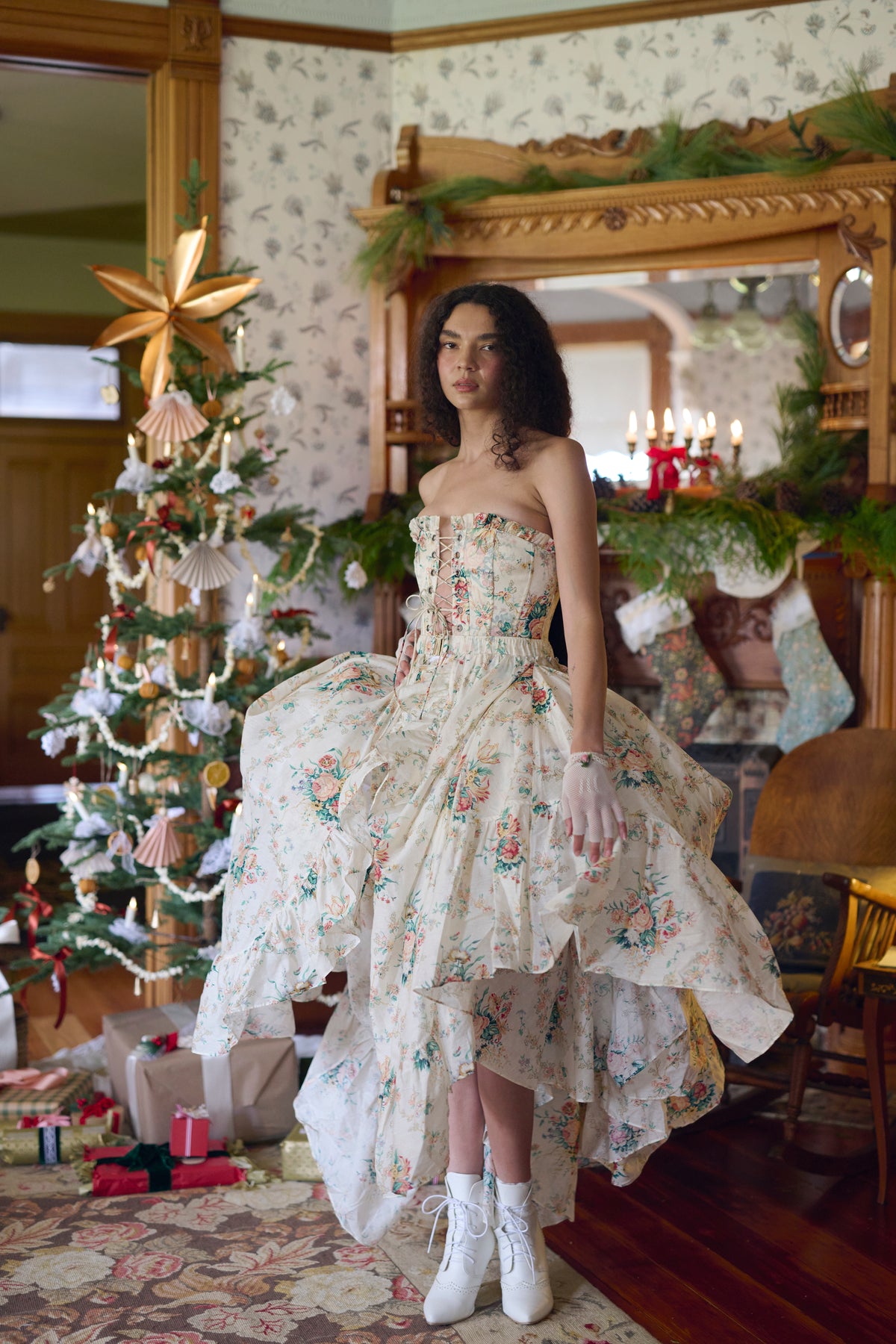 Strapless and fully-boned, the À La Mode Corset in Garland is designed to make you feel ravishingly beautiful—two fully adjustable draw cords lace up the center, so you may cinch it as you please. Tiny ruffle details at the bust add additional femininity, and garter bows descend below the waist.