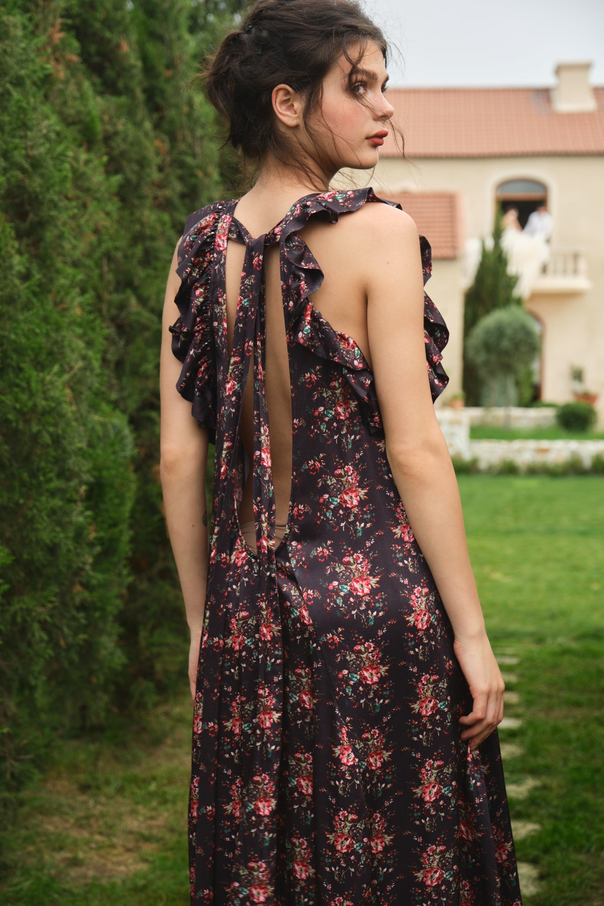 The Romance Dress in Cassis Rose features gathered frills, a high neckline, and a backless trapeze silhouette for a dreamy, relaxed elegance.
