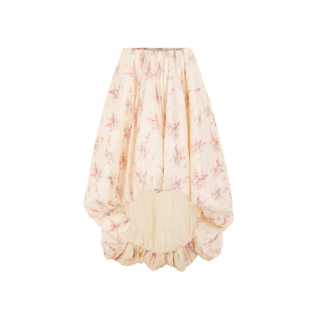 The Lavish Skirt is a high-low skirt featuring an antique-inspired floral print and a gathered bubble effect for added volume. It includes hidden pockets. Can be worn with the matching coquette top as a set or on its own.